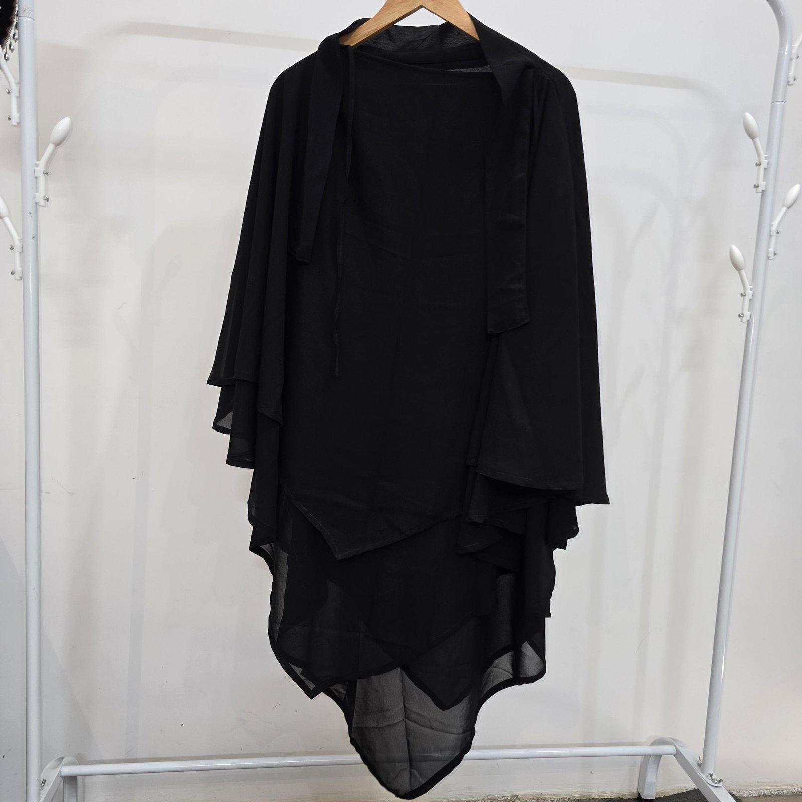 Effortless Full Coverage, Lightweight, Triple Layer At Back, Dual Layer At Front, Length At The Front Is 40 Inches And At The Back Is 46 Inches, Unique Niqab Feature, Easy To Style, Tie Back Strings.