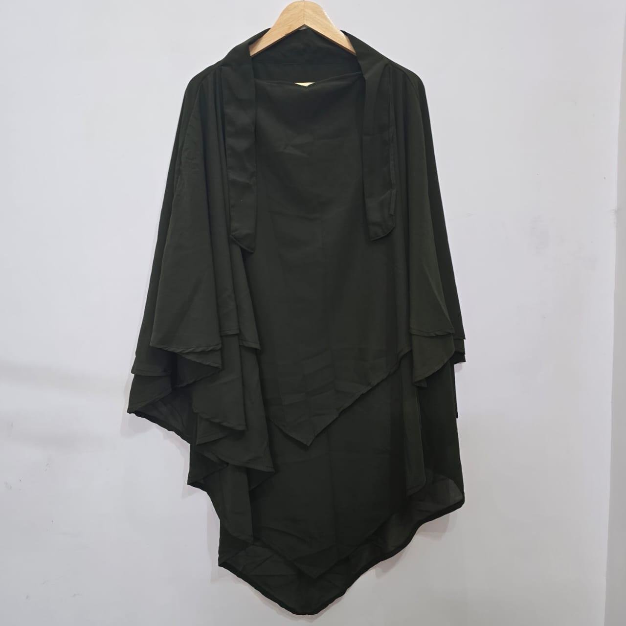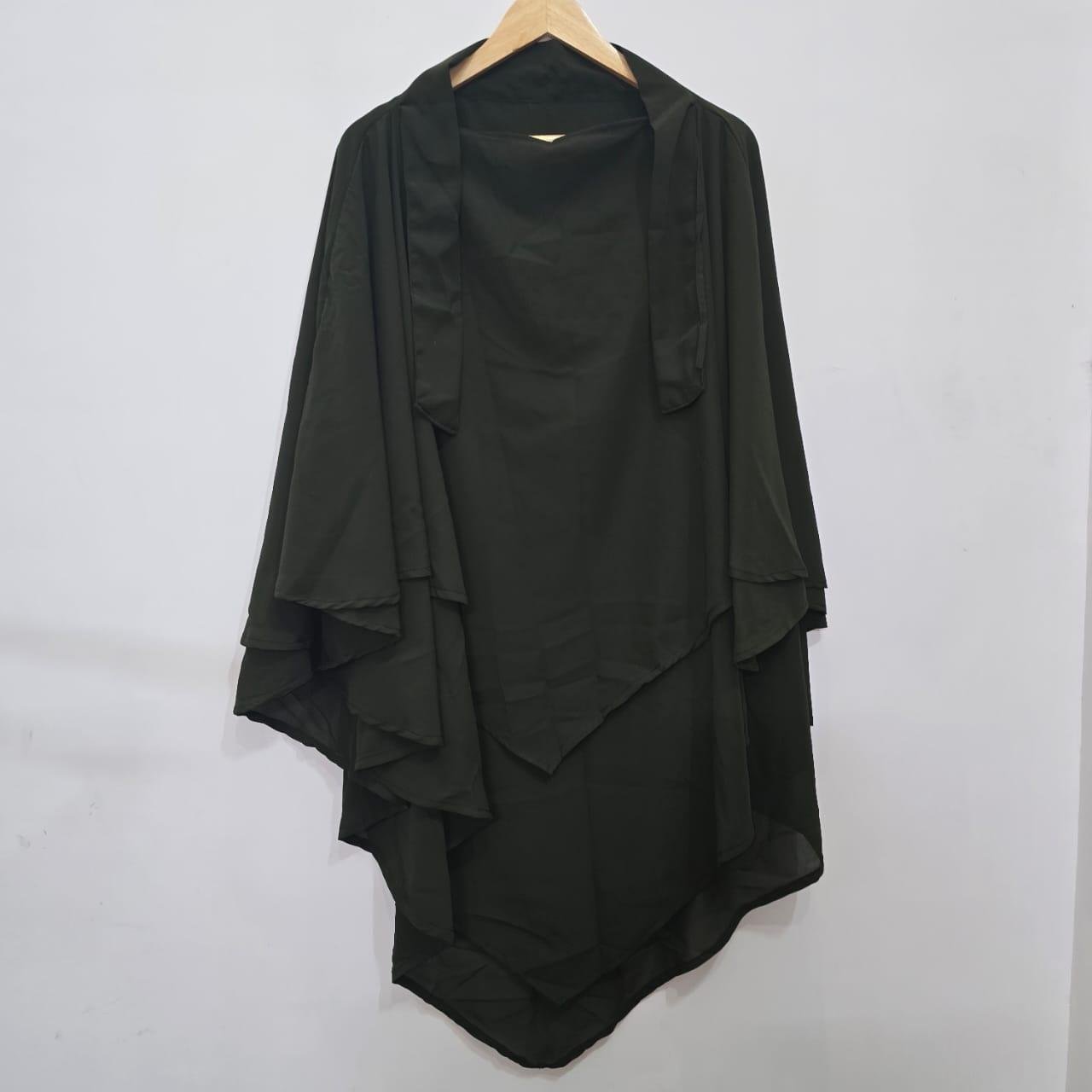 Triple Layer At Back, Dual Layer At Front, Length At The Front Is 40 Inches And At The Back Is 46 Inches, Unique Niqab Feature, Easy To Style, Tie Back Strings.