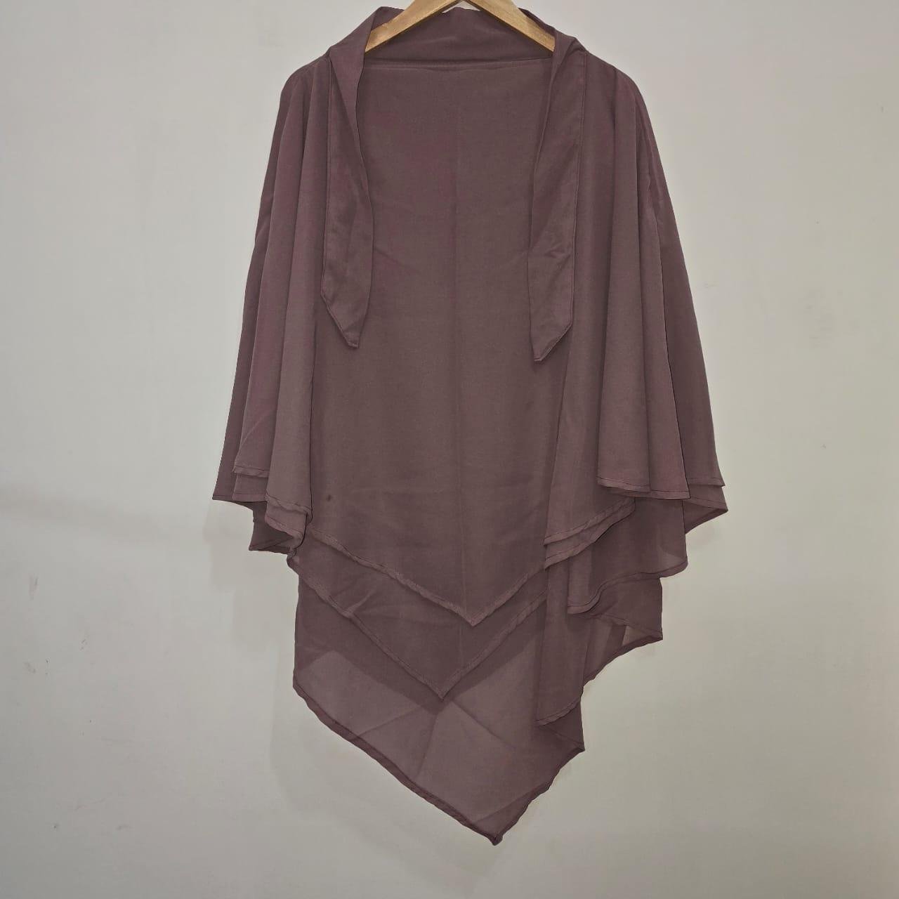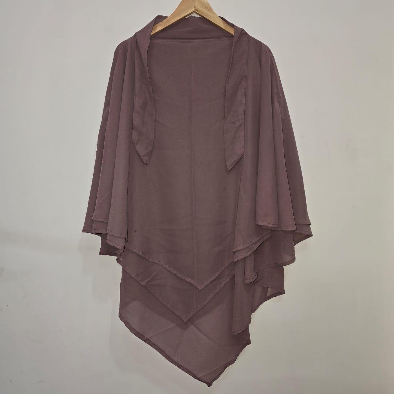 Triple Layer At Back, Dual Layer At Front, Length At The Front Is 40 Inches And At The Back Is 46 Inches, Unique Niqab Feature, Easy To Style, Tie Back Strings.
